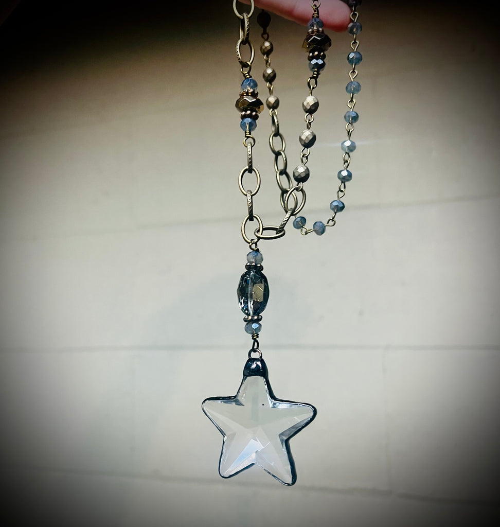 Antique glass star pendant necklace with 27 inch vintage style chain