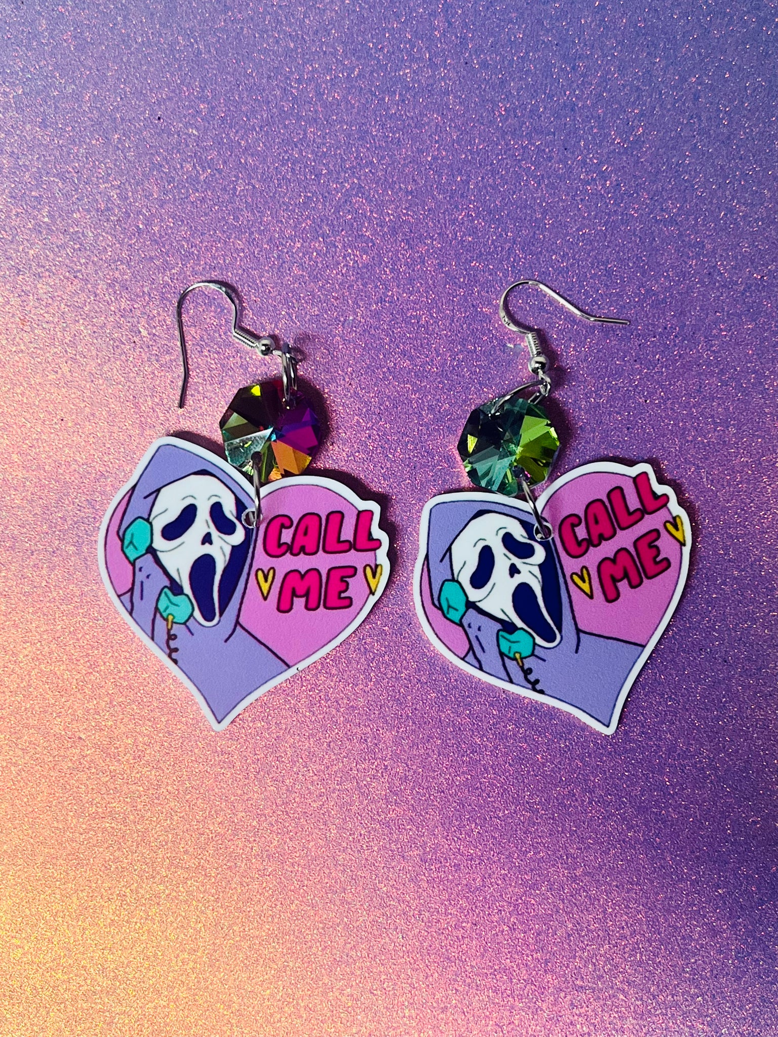 Adorable handcrafted heart shaped ghostface from the scream movie series dangle earrings with hypoallergenic fish hook style earring hooks